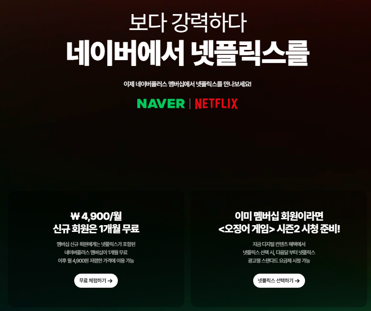 넷플릭스를 더 경제적이고 효율적으로 즐길 수 있는 방법을 찾고 계신가요? 네이버플러스 멤버십이 정답입니다! 월 4,900원으로 넷플릭스와 다양한 혜택을 누려보세요. 신규 가입자는 1개월 무료 체험 혜택도 함께 드립니다.